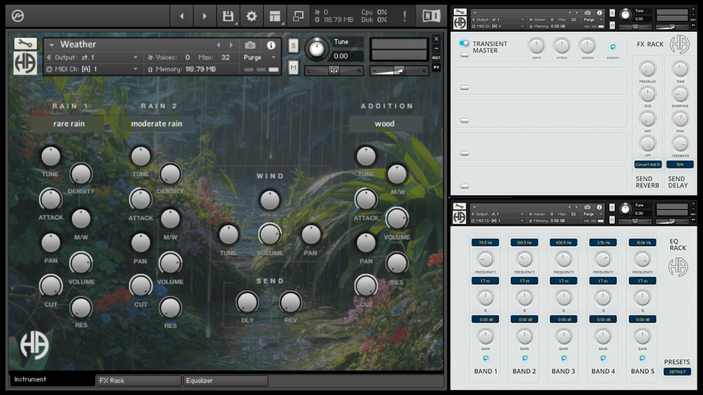 Weather Kontakt Library is a deeply detailed sound design instrument built to capture the atmosphere of rain and wind with remarkable realism. Recorded at pristine 48 kHz, it offers a versatile palette of weather inspired textures for composers, sound designers, and producers.