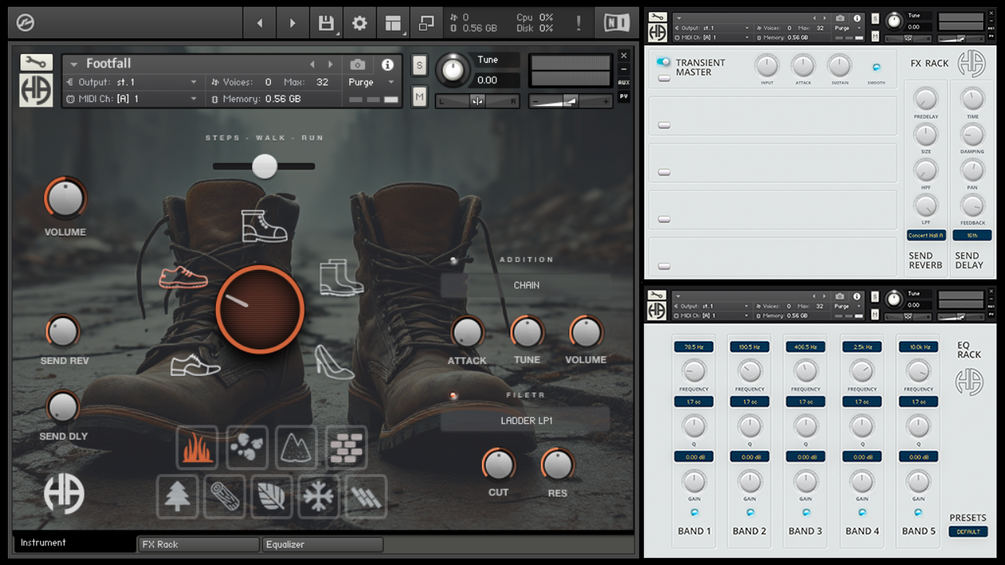 FOOTFALL Kontakt Library is VST plugin includes 5 types of shoes with 9 surfaces and 13 addition material. This library help you to create realistic footstep and movement sounds for film, game, video and post-production FOOTFALL contain 2445 samples. Easy intuitive menu which allow you choose type of shoes and type of ground, and speed of walking, from steps to run. With this library you can add some addition in to steps and combine samples.